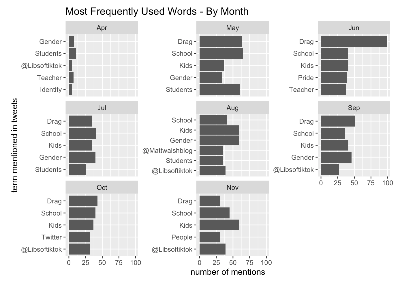 Within the overall dataset of Tweets, the five most used words by Libs of Tik Tok during the date range were “drag”, “school”, “kids”, “gender”, and “family”. Of note is the frequency in which specific target types were mentioned, specifically “drag”, “school”, “teacher”, and “Queen”.